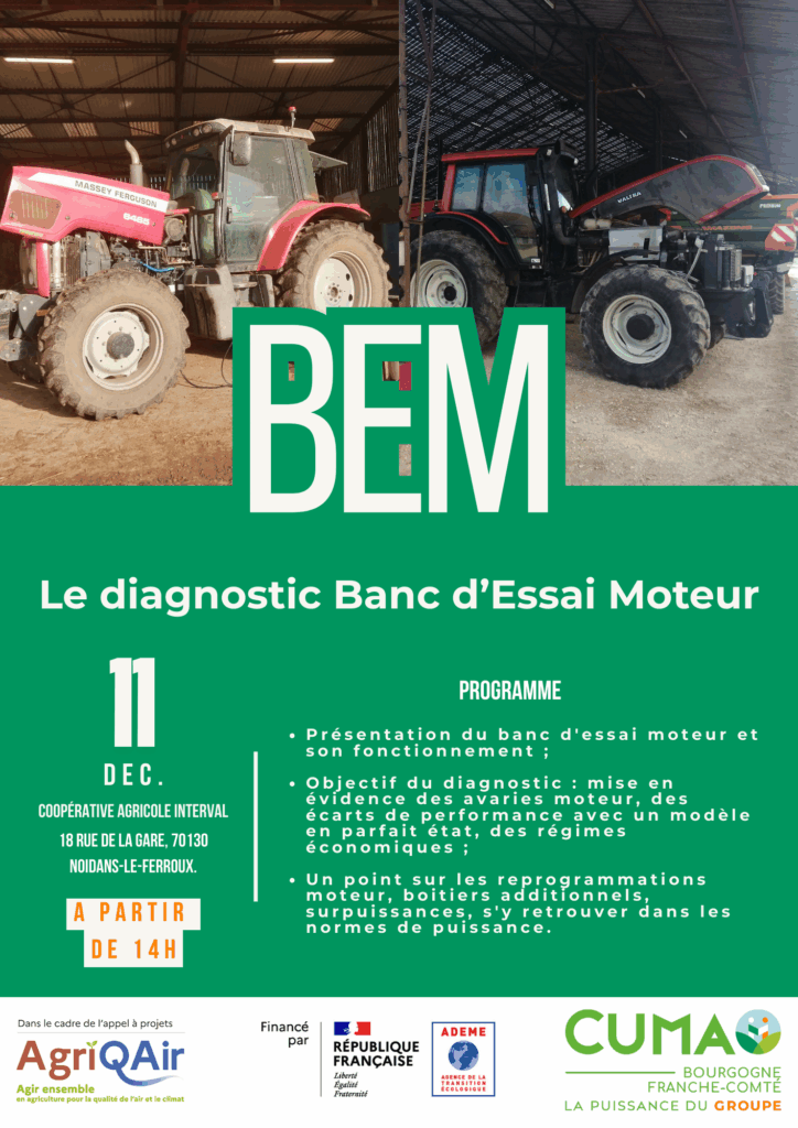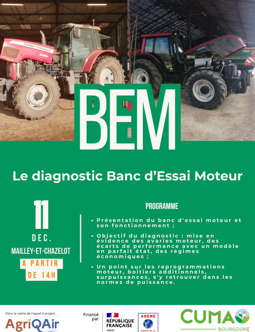 La FRCuma Bourgogne–Franche-Comté vous invite à une session de démonstration du Banc d’Essai Moteur (BEM), un outil permettant d’évaluer précisément la performance des moteurs de tracteurs.