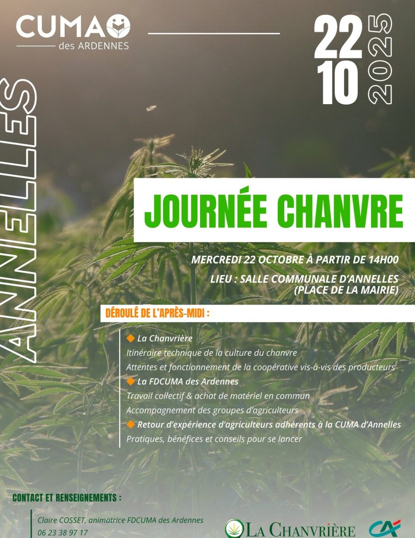 Le mercredi 22 octobre prochain, venez rencontrer la Chanvrière, des adhérents de la Cuma d’Annelles et la FDCuma des Ardennes autour de la thématique du chanvre.