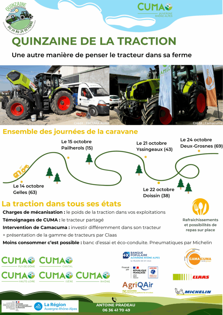 La FRCUMA AuRA organise une caravane de démonstration autour de la traction partagée et des économies de charges de mécanisation en octobre 2025 dans 5 départements le Puy de Dôme, le Cantal, la Haute Loire, l’Isère et le Rhône.