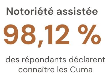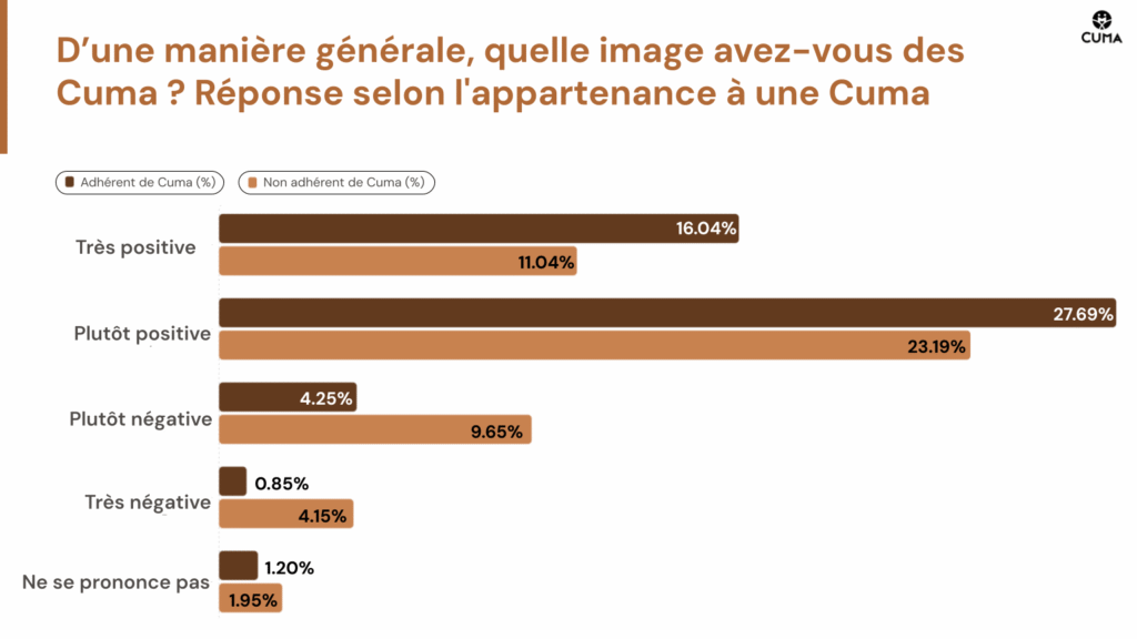 À la question « Connaissez-vous les Cuma ? », 98,12 % répondent oui, 1,20 % disent en avoir entendu parler, et seulement 0,68 % répondent non. C’est un score extrêmement élevé.