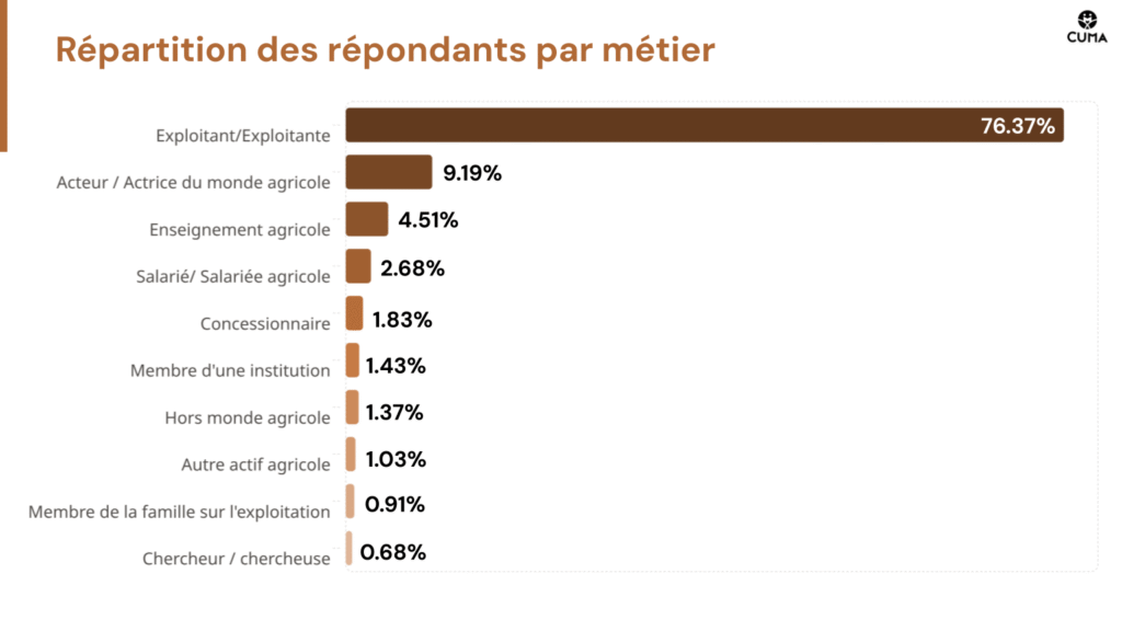 – 76,37 % d’exploitants/exploitantes qui déclarent pour 84,85 % être membres d’une Cuma.