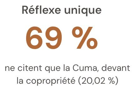 La notoriété spontanée est massive. 96,39 % des répondants citent spontanément les Cuma parmi les structures permettant de mutualiser du matériel agricole, et 69,15 % ne citent qu’elles. À titre de comparaison, la copropriété n’est citée spontanément que par 20,02 % des répondants.