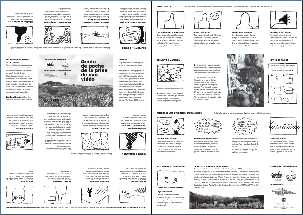 Le projet VIREG porte sur le recyclage d’outils pour concevoir collectivement de nouveaux outils viticoles. Ce guide de poche a donc été conçu pour faciliter la prise de vue collective et documenter au fur et à mesure la conception puis le prototypage d’outils agricoles autocontruits. Il se concentre sur le volet « captation audio-vidéo » et n’aborde ni les questions de réalisation ni de montage. Il est adapté à toute personne débutante souhaitant filmer à des fins documentaires, avec une caméra ou un smartphone.