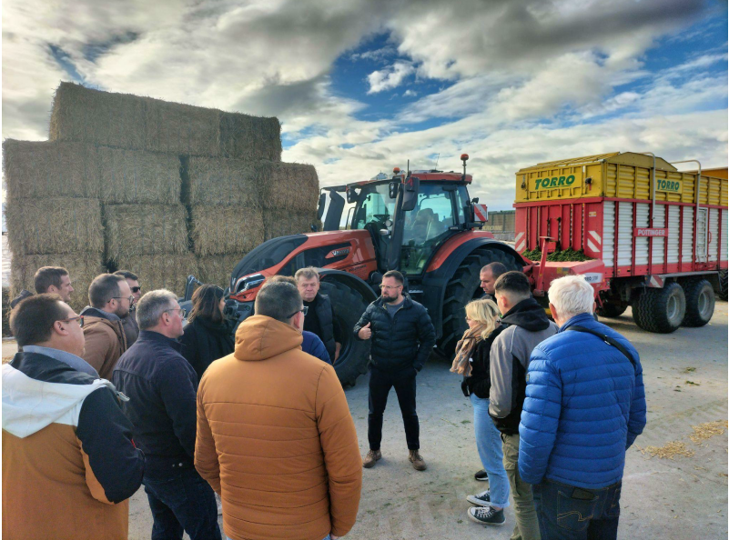 Échange avec l’éleveur sur le choix de la chaîne de récolte et l’alimentation du troupeau. En arrière plan, un ensemble tracteur/remorque autochargeuse qui assure la récolte des fourrages verts notamment la luzerne.