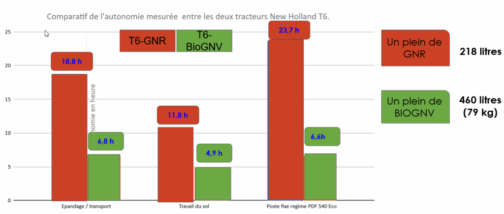 GNR : mesuré en litres. BioGNV : mesuré en kilos. Un kilo de méthane contient un peu plus d’énergie qu’un litre de diesel. Ce qui compte, c’est le coût pour réaliser le même travail agricole, pas la conversion stricte.