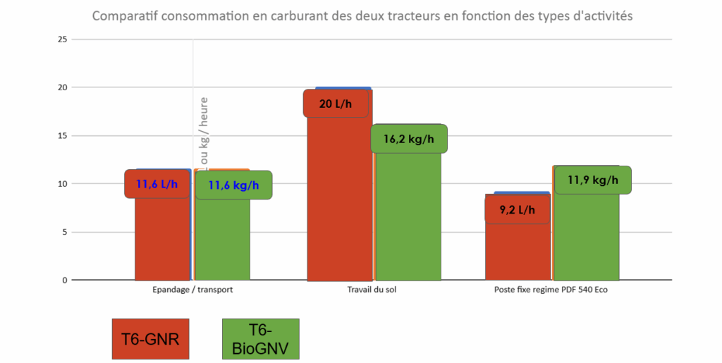Travaux à la PDF (prise de force) : le GNR reprend l’avantage, consommant 9,2 l/h contre 12 kg/h pour le BioGNV.