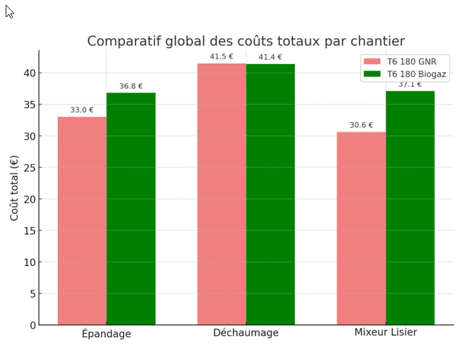 BioGNV favorable (1 €/kg vs 1,5 €/l GNR) : avantage au BioGNV pour l’épandage et le déchaumage.