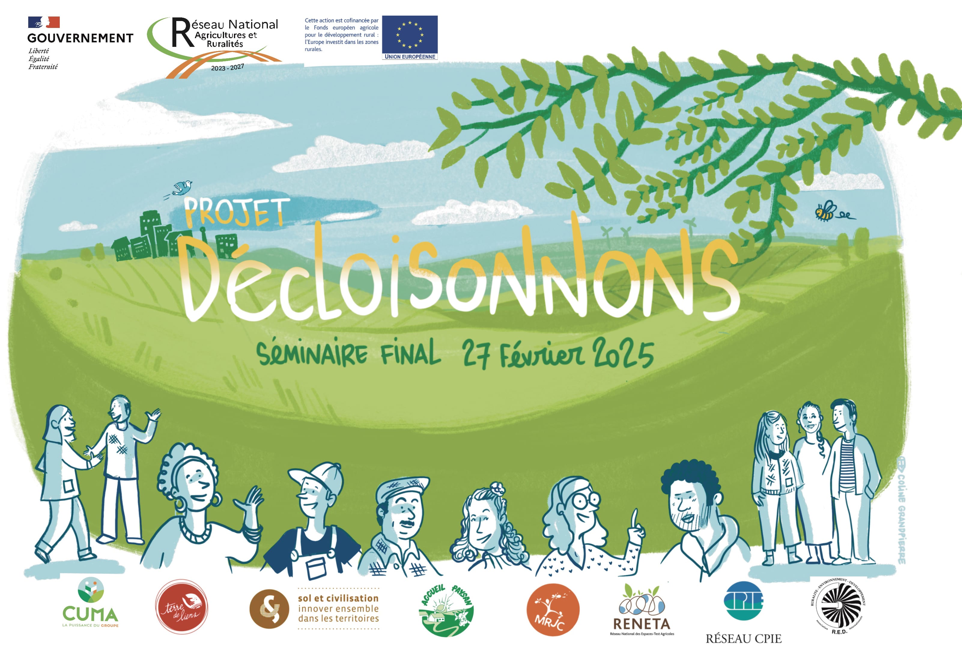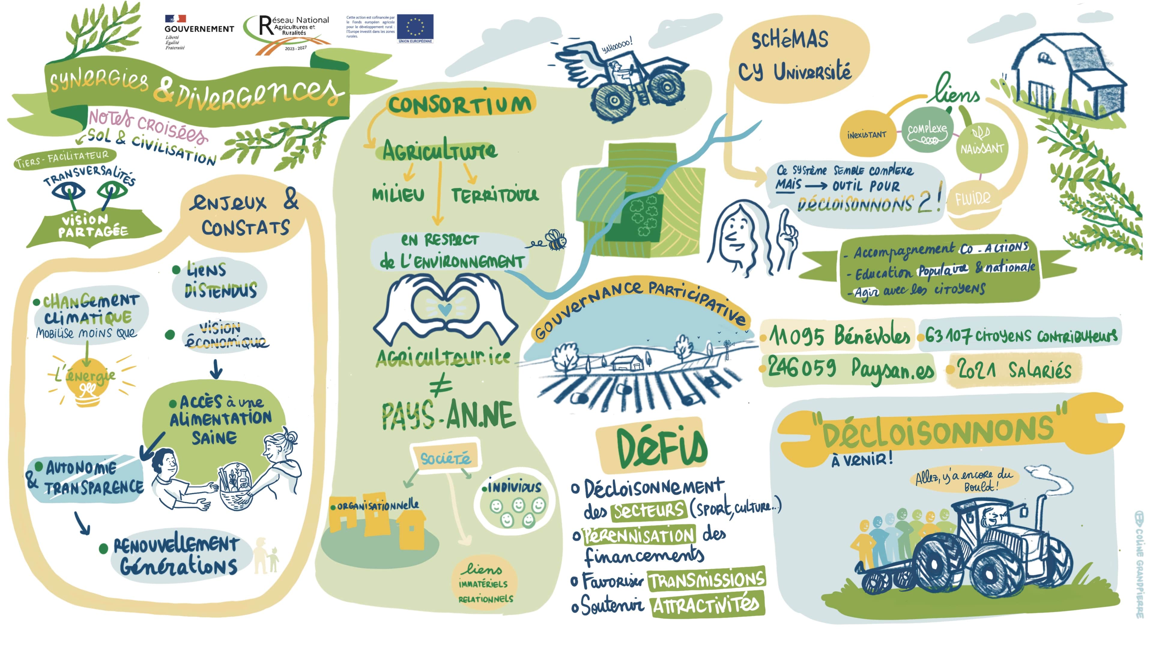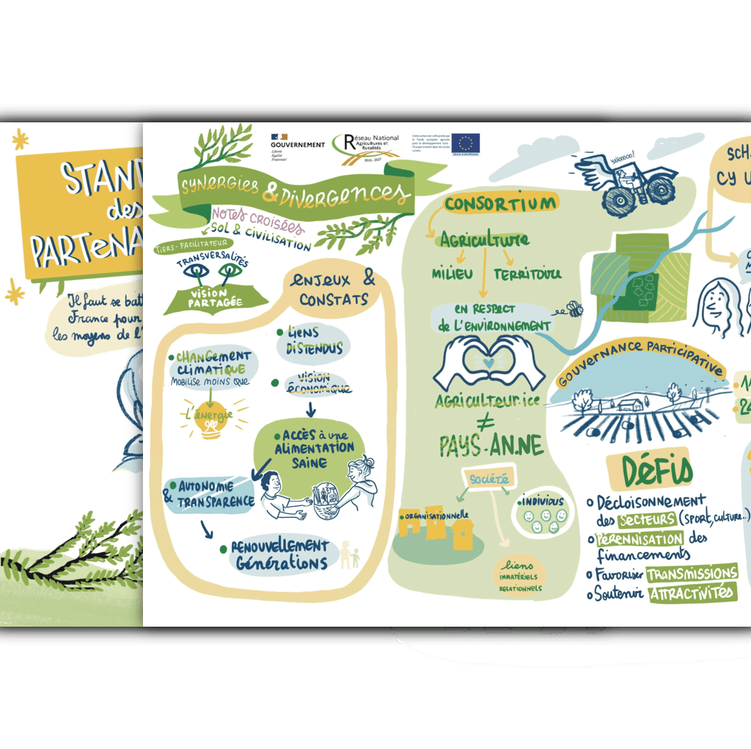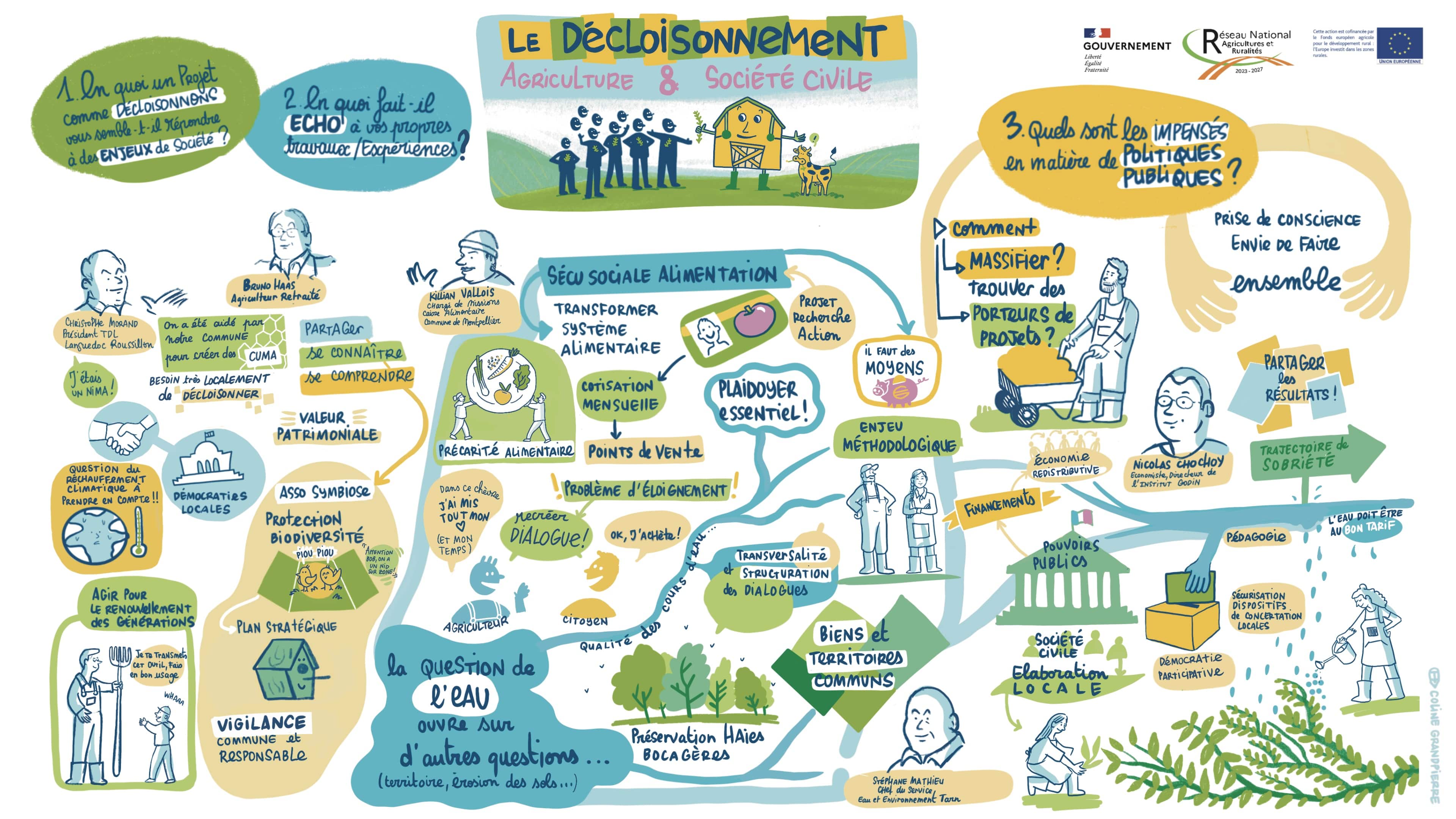 Le 27 février s’est tenu le séminaire final du projet DECLOISONNONS, réunissant la FNCuma et 7 partenaires, les membres de leurs réseaux et des agriculteurs et agricultrices de collectifs, autour du thème “Le décloisonnement du monde agricole et du milieu rural”. Coline GRANDPIERRE, facilitatrice graphique, a illustré tout au long de la journée les temps forts du séminaire.